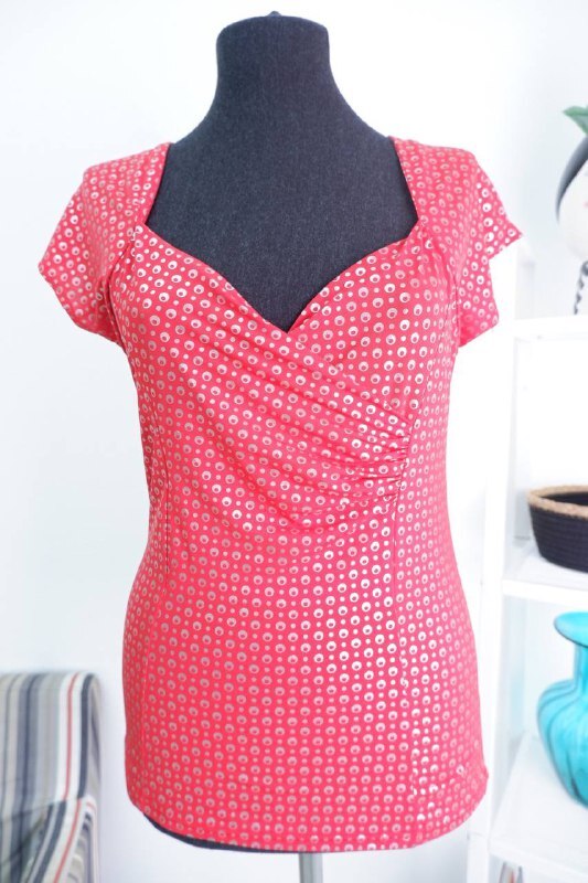 4. Описание: Блузка из искусственного материала в красном цвете дополнена мелким геометрическим принтом. Изделие с коротким рукавом и вырезом-галочкой.
