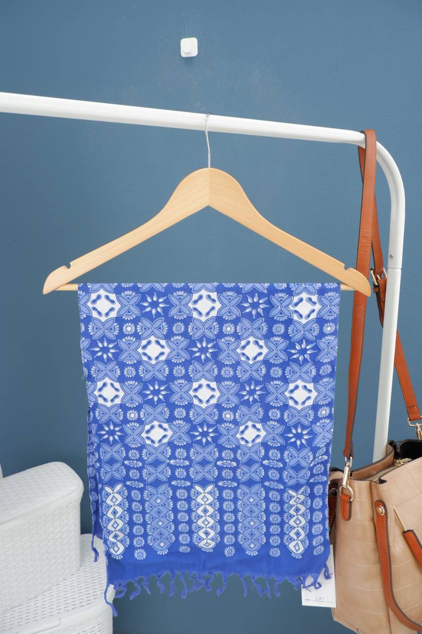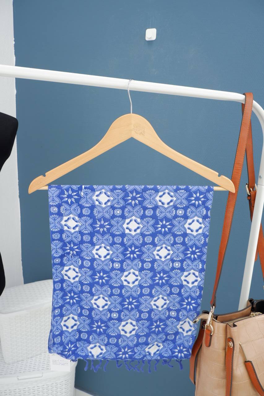 4. Описание: Женский платок из искусственного материала в сине-белой цветовой гамме с мелкой бахромой и абстрактным изображением.