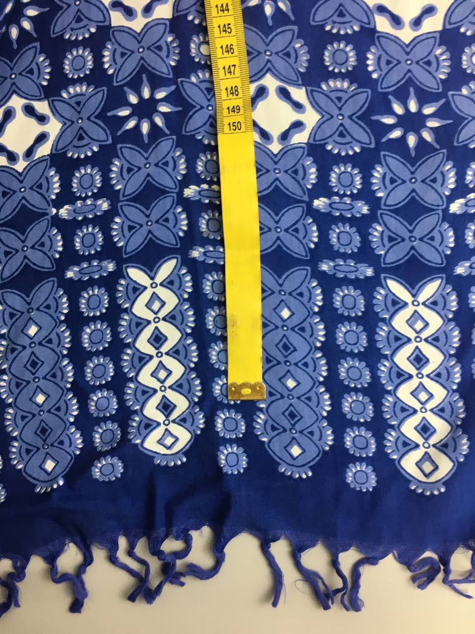 Шарф в сине-белой цветовой гамме с мелкой бахромой. Листайте фото с замерами вправо.