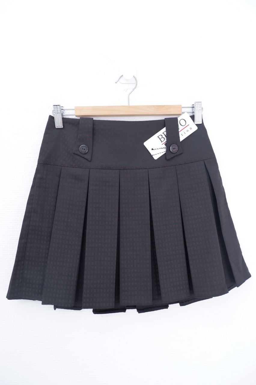 4. Описание: Юбка А-силуэта в темно-сером оттенке на потайной молнии сбоку, с декоративными элементами на поясе. Изделие в среднюю складку с легким квадратным принтом.