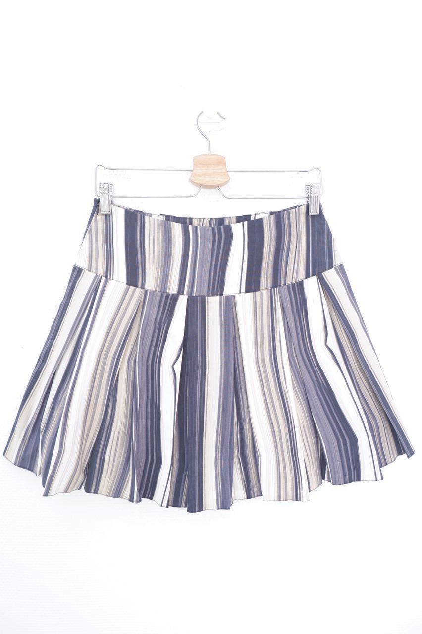 4. Описание: Цветная юбка А-силуэта в мелкую складку с принтом вертикальных волн. Изделие на молнии сбоку имеет широкий пояс с декоративными миниатюрными элементами.